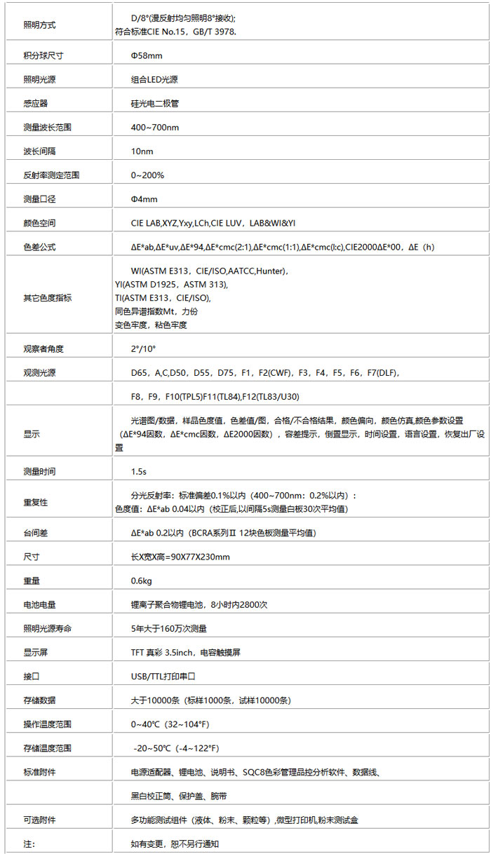 2.標(biāo)準(zhǔn)D/8°(漫反射均勻照明8°接收)符合標(biāo)準(zhǔn)CIE No.15,GB/T 3978;