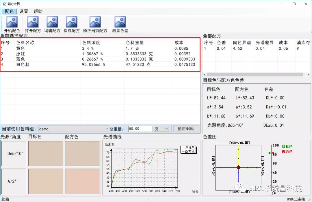 HRC華銳昌分光測色儀精度較高,用了預定位板的設定,免去了傳統測色儀、色差儀校準過程中需要使用標準黑板和白板的過程,內置軟件功能強大,包含所有必要的色彩方程式、適合不同任務的標準光源,及大量特定行業及應用的指標,光譜式的測量原理,提供了很高的測量精度,再配合使用專業的配色軟件電腦調色,指定完整的顏色管理方案。