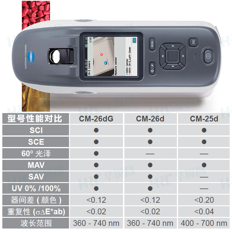 柯尼卡美能達(dá)的新一代CM-26dG系列,包含三款便攜式分光測(cè)色計(jì)型號(hào),高端旗艦型號(hào)CM-26dG和CM-26d擁有精湛的技術(shù)和業(yè)界快速的測(cè)量精度,其中,CM-26dG是二合一機(jī)型,可同時(shí)進(jìn)行色彩與光澤測(cè)量,CM-26d專注于色彩測(cè)量,CM-25d則是該系列的經(jīng)濟(jì)高效型號(hào),高性價(jià)比之選。